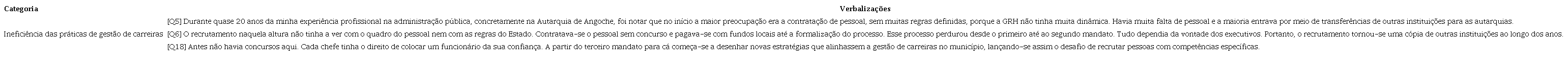 b) Ineficiência das práticas de gestão de carreiras: os depoimentos apresentados pelos entrevistados indicam que as carreiras dos servidores públicos moçambicanos se desenvolvem num contexto de carências orçamentais. Apesar disso, houve reconhecimento de que o processo de recrutamento, seleção e gestão de carreiras evoluiu ao longo nos últimos cinco anos. Já no passado, o processo era precário, pouco transparente e disfuncional no que diz respeito ao cumprimento das normas, cuja seleção de servidores públicos dependia da confiança político-partidária. Com as mudanças nas formas de governação que ocorrem de cinco em cinco anos, sobretudo no contexto municipal, houve tendência de se observar os procedimentos de GRH flexíveis que é um bom ponto de partida para o aprimoramento das práticas de gestão de carreiras, procurando, desse modo, recrutar pessoal competente, embora prevaleçam algumas fragilidades da GRH, como a seleção de candidatos por meio de afinidades partidárias. Tais factos são ilustrados no Quadro 4 :