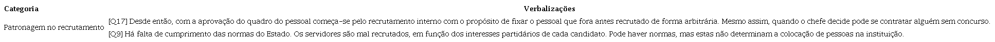 c) Patronagem no processo de recrutamento: os entrevistados foram consentâneos ao considerar que esta surge na sequência de disfunções dos procedimentos de GRH, pois o processo de tomada de decisão para o recrutamento, seleção e gestão de carreiras dos servidores públicos tem sido discricionário. Apesar disso, os participantes estão cientes de algumas melhorias registadas nas estratégias de GRH no setor público moçambicano, que visam promover práticas inovadoras e flexíveis para eliminar os vínculos precários que alguns servidores públicos ostentam, evitando recrutamentos arbitrários. Mesmo assim, a execução das práticas de recrutamento e seleção continuam a ser influenciadas por um cunho de natureza político-partidária, com tendência de favorecer certos candidatos no provimento de carreiras públicas, violando o princípio de transparência do setor público. Tais fatos são elucidados no Quadro 5 :
