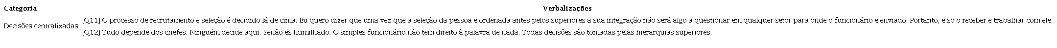 d) Decisões centralizadas: os depoimentos dos entrevistados mostram que processo de recrutamento e seleção e gestão de carreiras dos servidores públicos é influenciado pelas decisões hierarquizadas. As decisões tomadas de cima para baixo são uma característica dos modelos de governação burocrática, onde o controlo de todo o processo de GRH depende das influências das vieses de decisão do tipo top-down . Os depoimentos mostram que, embora se apliquem os procedimentos de recrutamento e seleção, as hierarquias superiores têm o poder de os manipular, no sentido de promover interesses particularistas, atuando como rent seekers . As evidências desses achados são apresentadas no Quadro 6 :