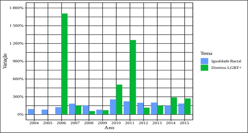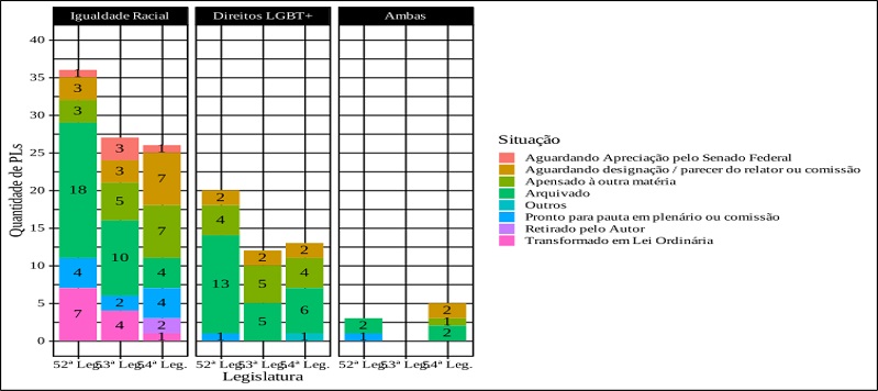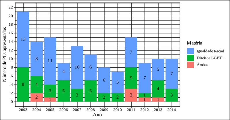 Conforme mencionamos na introdução deste artigo, apesar da disposição governamental das administrações petistas para apoiar as reivindicações dos movimentos negros e LGBT+, estudos anteriores sugerem que tais políticas foram acompanhadas por níveis distintos de suporte e oposição parlamentar bem como ocorreram em intensidade e estabilidade distintas ( Machado; Rodrigues, 2015). A próxima seção busca mapear e analisar de forma sistemática tais diferenças.