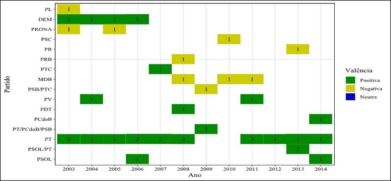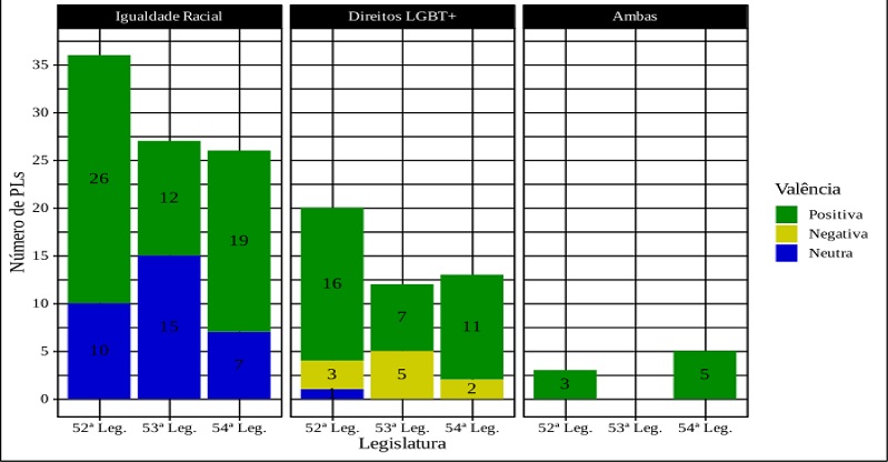 Para analisar a valência da produção legislativa sobre igualdade racial e direitos LGBT+, adaptamos a classificação utilizada pelo Fórum Permanente de Promoção da Igualdade Racial (FOPIR) em relatório publicado em 2018 6, e replicada por Santos (2019), que categoriza as propostas legislativas que impactam a população negra em: positiva, negativa, indiferente ou ambivalente. Após a leitura das ementas e justificativas dos 142 projetos de lei, optamos por classificá-los em apenas três categorias: positivos, negativos e neutros. Uma proposição é considerada positiva quando seu conteúdo dispõe sobre temas relevantes e que possam ampliar a garantia de direitos para a população especificada no PL. Consideramos neutras as proposições cuja relevância para a população especificada tende a ser indireta e ter uma dimensão mais simbólica do que prática. Por fim, PLs que se opunham às demandas dos movimentos negro e LGBT+ ou propunham medidas de restrição de direitos à população especificada foram classificados como negativos. A planilha com os dados sobre os PLs selecionados para a amostra e sua categorização está disponibilizada no Apêndice 01 7.