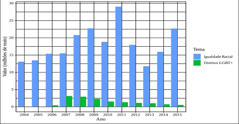 Em relação aos dados do orçamento federal, mapeamos os valores destinados a ações governamentais exclusivamente relacionadas à promoção de igualdade racial e aos direitos LGBT+ nos projetos de Lei Orçamentária Anual (PLOA) - enviados pelo Executivo ao Congresso Nacional - e nas leis orçamentárias anuais (LOA) aprovadas pelo Congresso Nacional após a inclusão de emendas e outras mudanças. Trabalhamos com as PLOA e LOA apresentadas e aprovadas para os anos de 2004 a 2015, pois o ciclo orçamentário é realizado um ano antes do ano de referência do orçamento e, portanto, foram esses os orçamentos propostos e aprovados pelos governos em análise. Partimos do pressuposto de que os valores destinados no PLOA às ações pertinentes ao nosso estudo são um bom indicador dos efeitos políticos dos movimentos sobre o Poder Executivo, e que a ampliação do orçamento inicialmente proposto pelo Executivo por meio de emendas parlamentares é um bom indicador dos seus efeitos políticos sobre o Poder Legislativo, na medida em que a inclusão das emendas, em muitos casos, é conquistada a partir da articulação entre ativistas e parlamentares.