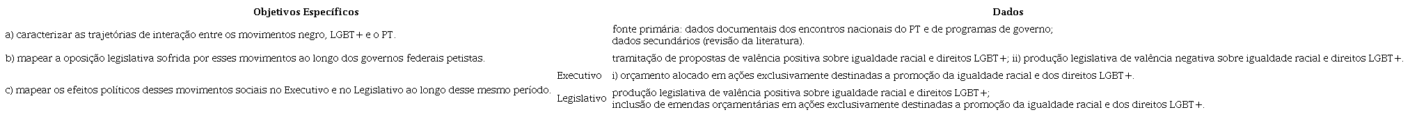 Para avaliar as quatro hipóteses detalhadas na seção anterior, estabelecemos três objetivos específicos para este artigo: a) caracterizar as trajetórias de interação entre os movimentos negro, LGBT+ e o PT; b) mapear a oposição legislativa sofrida por esses movimentos ao longo dos governos federais petistas; e c) mapear os efeitos políticos desses movimentos sociais no Executivo e no Legislativo ao longo do mesmo período. O Quadro 1 relaciona os objetivos específicos da pesquisa aos procedimentos metodológicos adotados para sua consecução.