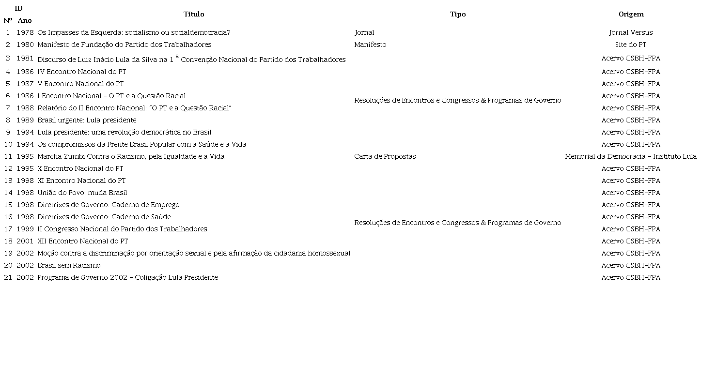 Em relação ao primeiro objetivo, analisamos documentos do acervo histórico do Centro Sérgio Buarque de Hollanda de Documentação e História Política, vinculado à Fundação Perseu Abramo (Acervo CSBH-FPA). De forma complementar às evidências apontadas nos documentos coligidos, realizamos uma revisão da literatura sobre o tema, dela extraindo evidências secundárias a respeito da trajetória dessas relações. Analisamos documentos que sistematizaram as resoluções dos encontros nacionais do PT realizados entre 1986 e 2001 bem como documentos que compunham os planos de governo apresentados pelas candidaturas petistas às eleições presidenciais entre 1989 e 2002, de forma a mapear a incorporação dessas demandas na agenda desse partido. No Quadro 2, relacionamos os documentos utilizados para a consecução desse objetivo específico