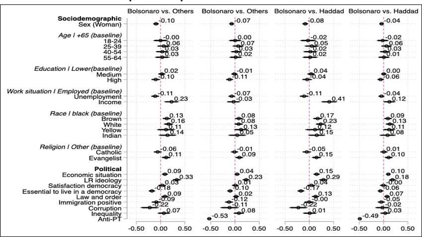 On the other hand, by trying to disentangle the factors that led a voter to support Bolsonaro instead of the PT candidate, Haddad, we found that income, race (White), religion (Evangelical Christian), indifferent or negative sentiments toward democracy, and preference for mano dura policies are the factors that best explain the vote for Bolsonaro (even in the fourth model which includes the anti-PT variable). Corruption loses its statistical significance when we control for anti-PT sentiment.