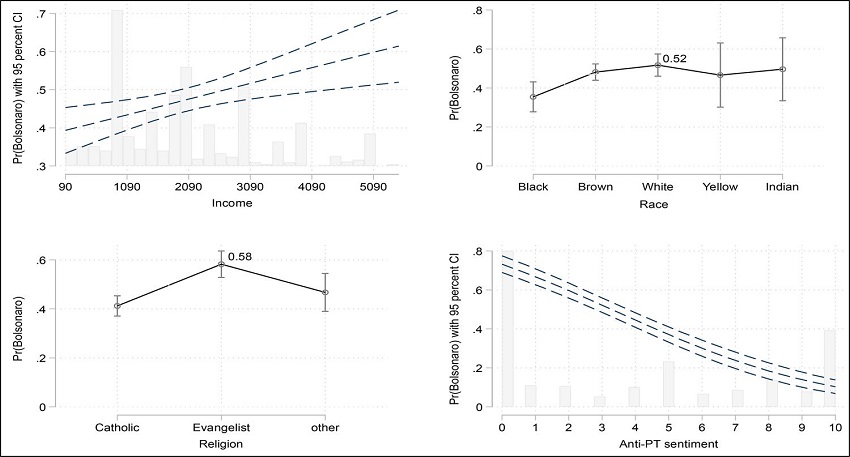 Figure 2 displays specific marginal effects for the most relevant explanatory variables for the vote for Bolsonaro (i.e., race, religious identification, income, and antipetismo ). Additionally, this figure sheds light on the likelihood of electoral support for Bolsonaro over other candidate options. The results are clear and reinforce the Average Marginal Effects (AMEs) displayed in Figure 1 : higher income and highly educated persons, Whites, Evangelical Christians, and anti-PT voters as well as individuals who prefer stricter measures regarding law and order and those with low levels of support for democracy were more prone to support the former army captain Jair Bolsonaro.
