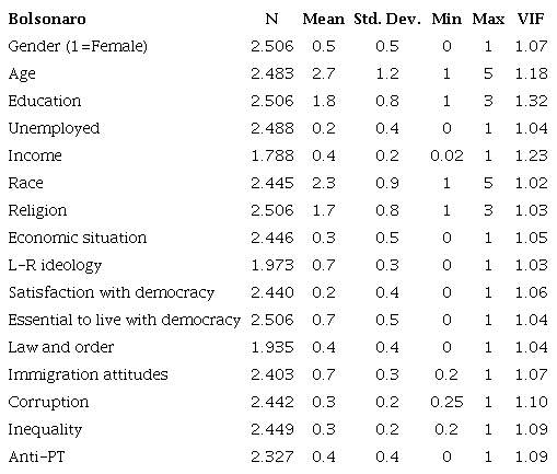 Regarding independent variables, we mainly focus on two different blocks: sociodemographic and political variables. Regarding the sociodemographic block, we regressed sex (1=female; 0=male), age (in categories: 18–24, 25–39, 40–54, 55–64, 65+), education level (1=lower; 2=medium; and 3=high), work situation (0=employed; 1=unemployed), income levels (continuous variable from the lowest to the highest value of monthly income); race (1=black; 2=brown; 3=white; 4=asian; 5=indigenous), and religious identification (1=catholic; 2=evangelical; 3=other or non-religious). The political block contains six variables: positive economic sociotropic evaluation (1=better economic situation; 0=worse economic situation), left-right scale (0=left; 10=right), satisfaction with democracy (0=satisfied; 10=unsatisfied), law and order (a coercive attitude goes against civil rights: 1=strongly agree; 2=agree; 3=neither agree nor disagree; 4=disagree; 5=strongly disagree), essential to live in democracy (1=a democratic political system is preferable; 0=the political system is indifferent or sometimes an authoritarian regime is preferable), immigration positive (0=people from other countries make the country worse; 10=immigrants make the country a better place to live), the fact of corruption as something generalized in Brazil (1=very generalized; 2=well generalized; 3=little generalized; 4=it hardly happens), inequality as one of the major problems in Brazil (1=yes), and anti-PT sentiments (0=lower likelihood to cast a vote for the PT; 10=higher likelihood to cast a vote for the PT).