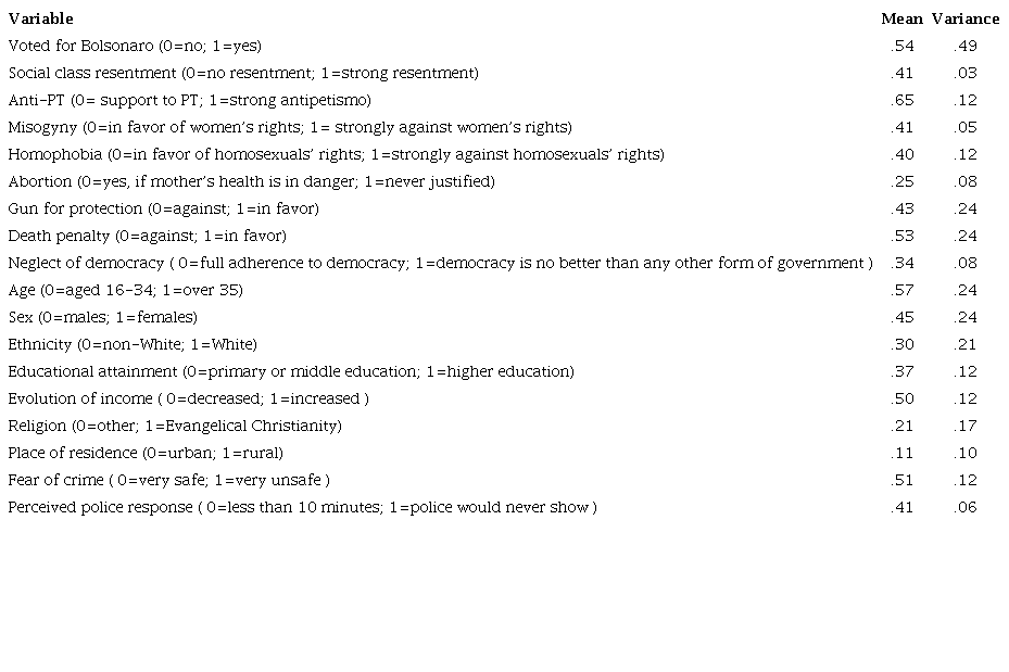 In Model c , a vote for Bolsonaro is postulated as being associated with conservative attitudes, in line with the conclusions of Norris and Inglehart (2019) . The operationalization of cultural backlash covered six variables linked with illiberal values, namely: (1) an index of homophobic attitudes, expressed as negative opinions about same-sex marriage and disapproval of homosexuals “ being permitted to run for public office ” ( r =.575; p≤ .001); (2) an index of misogyny, defined as the averaged combination of two variables focusing on the assumptions that “ men make better political leaders than women ” and that “ when a mother works outside the home, the children suffer ” ( r =.575; p≤ .001); (3) respondents’ opinions about abortion (e.g., “ It is justified to interrupt a pregnancy when the mother's health is in danger ”); (4) a variable establishing willingness to adhere to democracy, retrieved from the following question: “ Democracy may have problems, but it is better than any other form of government. To what extent do you agree or disagree with this statement? ”, with lower values indicating greater hostility to democracy; in addition to two variables, (5) one retrieved from a question asking whether respondents “ would have a gun for protection ” and (6) another allowing respondents to be identify as being “ in favor of capital punishment for those guilty of murder ”. While the inclusion of the last two measures might appear unorthodox compared to the original proposal by Norris and Inglehart (2019, p , p. 8), these authors recognize that “authoritarian values blended with populist rhetoric can be regarded as a dangerous combination fueling a cult of fear”. Acceptance of tough-on-crime policies and harsh punishment against those who violate the penal code (e.g., owning a gun for protection or supporting capital punishment) can therefore be regarded as an implicit component of the cultural backlash hypothesis, and more so in the context of Brazil, where rose-tinted views of the military dictatorship have been found to be strongly correlated with voting behaviors in Brazil during the 2018 elections ( Rennó, 2020) . All six variables encompassed in the operationalization of the cultural backlash hypothesis have been recoded or normalized to scale their original range to 0-1.