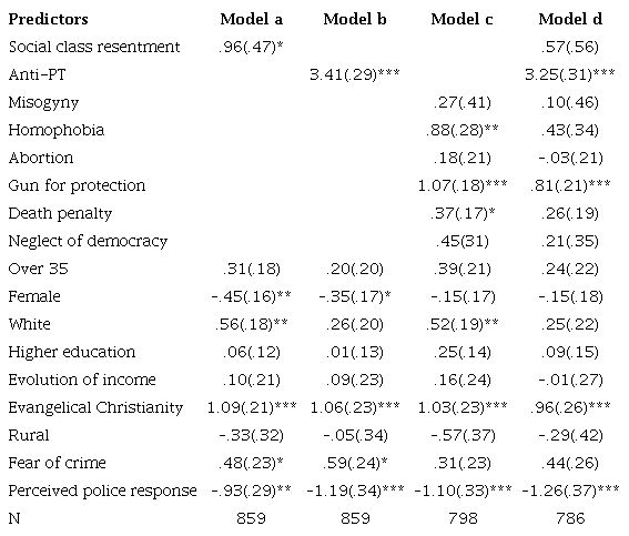 Finally, Model d reaffirms the disproportionate weight of negative partisanship as a driver of the authoritarian vote in the 2018 Brazilian elections (B=3.25; p≤ .001). As for the cultural backlash hypothesis, its influence is reduced after controlling for anti-PT, and only positions in favor of the right to keep and bear arms significantly correlate with the decision to vote for Bolsonaro (B=.81; p≤ .001) in Model d . In this regard, the results replicate the conclusions of Setzler (2020) .