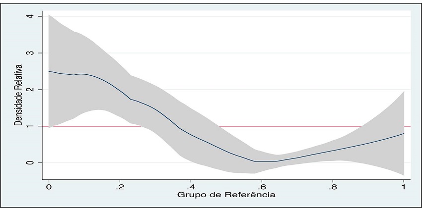 Em relação às mudanças distribucionais, aplica-se o gráfico de densidade relativa e o índice de polarização que compõem a medida de densidade relativa. No Gráfico 3 , o eixo x representa a distribuição do grupo de referência e o eixo y significa o aumento da densidade relativa em relação à distribuição da linha de base. Desse modo, o gráfico mostra o aumento ou a diminuição da distribuição do grupo de comparação (antipetismo) em paralelo ao grupo de referência (petismo). O objetivo é verificar o grau da distribuição como um todo. A polarização política visualmente é determinada pela distribuição bimodal perfeita: a curva encontra-se no formato de U, ou seja, o centro está subrrepresentado (g(r) <1) e as caudas estão sobrerrepresentadas (g(r) >1). Quando a densidade relativa é igual a 1, não há divisão entre os dois grupos e, portanto, não existe polarização política. As mudanças distribucionais são simétricas quando a densidade relativa das caudas é maior do que 1, perfazendo um movimento paralelo das caudas. A polarização é assimétrica quando uma cauda cresce desproporcionalmente mais do que a outra cauda.