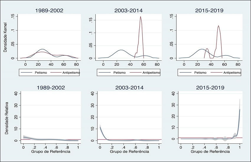 O Gráfico 5 mostra que a polarização política é forte no segundo e terceiro ciclos, anos que compreendem a entrada do PT no governo e o início do governo Bolsonaro. Conforme os gráficos da densidade kernel, as mudanças distribucionais entre o petismo e o antipetismo são visivelmente mais homogêneas no primeiro ciclo (1989-2002) e mais heterogêneas no segundo ciclo (2003-2014) e terceiro ciclo (2015-2019). Enquanto o antipetismo alcança a densidade de 0,15 pontos no segundo ciclo, a densidade do petismo é bastante diluída no tempo e nunca ultrapassa 0,05 pontos na curva. Através dessa técnica, pode-se afirmar que o antipetismo induz à polarização política no Brasil.