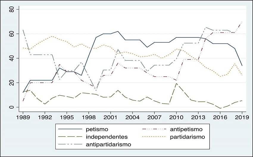 O crescimento do petismo explodiu em 2002, o ano em que o PT venceu a primeira eleição presidencial. Durante os mandatos de Lula (2003-2010), o petismo recuou e avançou, provavelmente em virtude dos escândalos de corrupção e da introdução de uma política econômica mais à direita, provocando o desalinhamento partidário dos simpatizantes históricos do PT ( Carreirão, 2008 ; Samuels, 2008 ). Após a estabilidade durante o primeiro mandato de Dilma (2011-2014), o petismo sofreu uma nova queda a partir de 2015, chegando ao índice de 34% das preferências partidárias positivas em 2019.