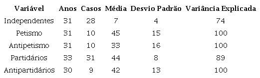 O resultado mostrou o coeficiente alpha de 0,51 e a correlação de 0,34 para toda a série temporal entre petismo e antipetismo. Somente coeficientes maiores do que 0,70 são considerados como indicativos de robustez de associação entre dois ou mais grupos. Sendo assim, o alpha de Cronbach confirma as baixas associação e correlação entre os dois grupos, de maneira que as mudanças ao longo do tempo são heterogêneas. A medida de associação ratifica, portanto, a polarização política entre o petismo e antipetismo.