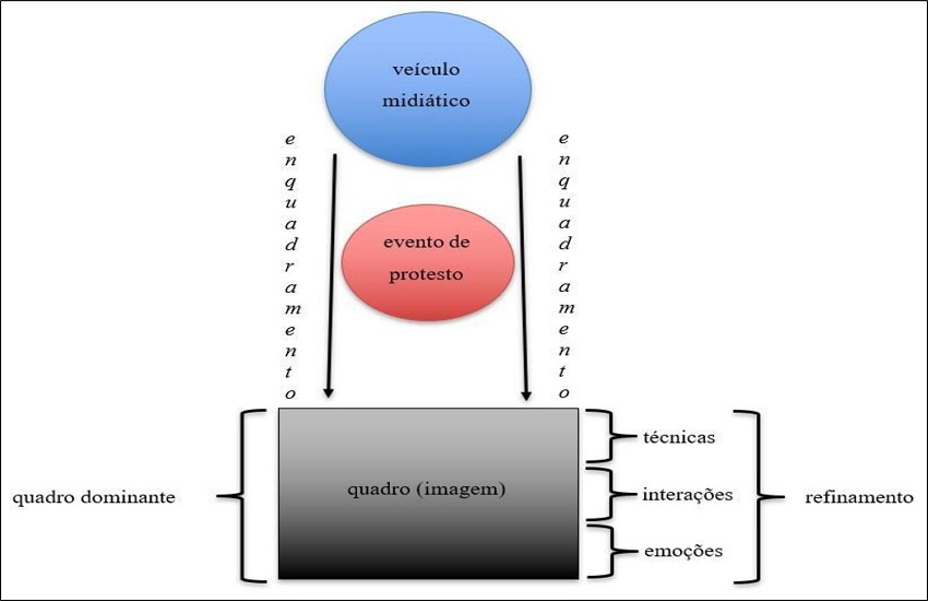 Segundo a perspectiva da teoria do confronto político, a ação dos movimentos sociais é necessariamente dinâmica e interativa (McAdam; Tarrow; Tilly, 2001), ou seja, nas arenas do confronto político, os atores que compõem os movimentos sociais interagem com outros atores (externos às organizações e aos grupos ativistas) na mobilização de recursos, mensagens e significados em torno do confronto. O processo de produção de mensagens sobre causas, injustiças e demais elementos do ativismo envolve não apenas a forma como grupos e organizações de movimentos sociais mobilizam símbolos, mas também a forma como outros atores interpretam o conflito. Esses processos interpretativos, concebidos conceitualmente como enquadramento ( framing ), configuram, portanto, um campo de disputa, no qual veículos midiáticos são atores centrais.