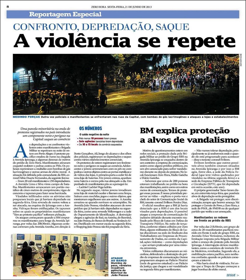 A cobertura de Zero Hora do protesto de 20 de junho foi publicada por meio de uma reportagem especial, que ocupou três páginas do jornal. A reportagem foi dividida em duas manchetes principais: “Em Porto Alegre milhares sob chuva e frio” ( Figuras 2 e 3 ); “Confronto, depredação, saque: A violência se repete” ( Figura 4 ). As manchetes indicam uma interpretação que distingue momentos (e táticas) específicos da passeata, enfatizando-se, por um lado, a grandiosidade do evento e, por outro, a adoção de táticas qualificadas como violentas. O texto também apresenta conteúdo sobre a postura do então governador Tarso Genro (Partido dos Trabalhadores – PT) e da Polícia Militar do Rio Grande do Sul (PMRS) diante dos protestos. O conteúdo escrito da reportagem confirma o que sugerem as manchetes, sendo fortemente marcado pela distinção entre um primeiro momento, em que ativistas teriam se reunido em uma grande, festiva e pacífica manifestação, e um segundo momento, em que atos de depredação (qualificados como “vandalismo”) teriam sido adotados por um conjunto pequeno de pessoas 14 .