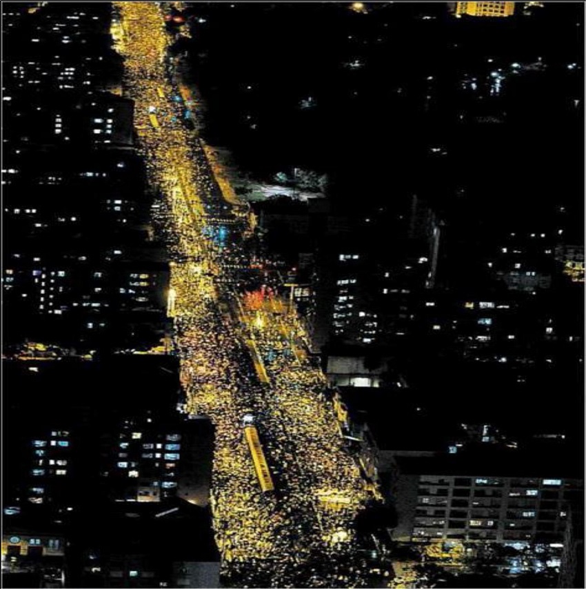 Na Figura 5 , o quadro dominante é a grande manifestação. Essa impressão inicial passada pela imagem é reforçada a partir das técnicas fotográficas utilizadas: a visão aérea deixa os manifestantes em tamanho pequeno, enfatizando, por outro lado, o grande número de ativistas na manifestação, a qual se estende por todos os pontos focalizados da avenida. A identidade e as reivindicações dos manifestantes não são especificadas, e se apreende da imagem que a tática de ação utilizada é a passeata.