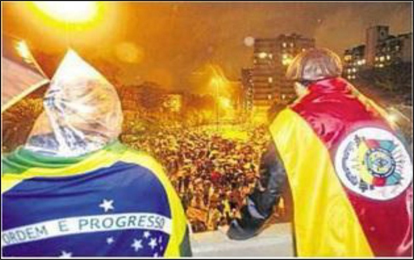 O contexto de junho de 2013 marca a (re)emergência do uso de simbologias patrióticas e regionalistas em eventos de protesto, elemento que tem se tornado objeto privilegiado de análise da literatura nacional (Cruz; Kaysel; Codas, 2015; Alonso; Mische, 2016 ; Alonso, 2017 ). Em Porto Alegre, enquanto os protestos dos meses iniciais do ano mobilizaram símbolos historicamente ligados à esquerda e a partidos políticos progressistas – momento em que a cobertura de Zero Hora aos protestos era centralmente negativa ( Fernandes, 2016 ) –, a emergência de símbolos nacionais e regionais em junho tende a ser exaltada por Zero Hora , e o jornal busca enfatizar o pertencimento de manifestantes a uma comunidade nacional/regional compartilhada. Enquanto, por um lado, esse procedimento pode disparar emoções dos tipos moral (como orgulho) e de lealdades e compromissos afetivos (como confiança e gosto), opera-se um relativo silenciamento da heterogeneidade, dos conflitos e das diferenças entre manifestantes. Novamente, ao se colocar como o “jornal do gaúcho”, Zero Hora mobiliza o “orgulho regional”, traço cultural historicamente marcante da população do Rio Grande do Sul.