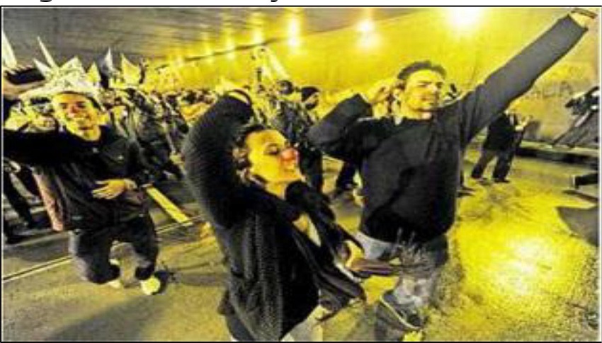 Na Figura 7 , o quadro dominante é a manifestação como festividade. As técnicas fotográficas oferecem a perspectiva de dentro do túnel, em frente aos manifestantes em destaque. O ângulo da imagem recai sobre manifestantes jovens, sorridentes, com os braços levantados, em movimento e entoando palavras de ordem e/ou cantos, enquanto, ao fundo, identifica-se a continuidade do protesto, com faixas e cartazes. A imagem indica, como identidade dos manifestantes, referências à multidão em festa; as reivindicações, por outro lado, não são especificadas.