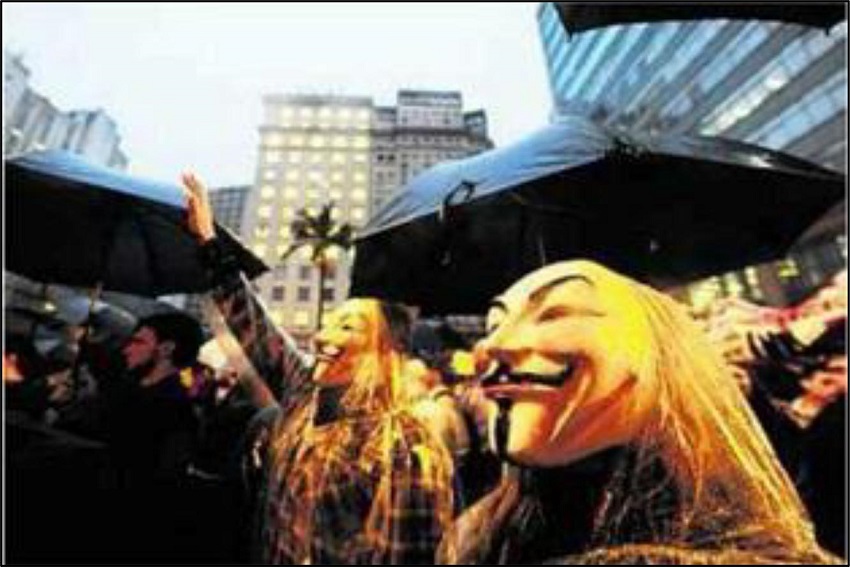 A Figura 8 evoca como primeira impressão (quadro dominante) manifestantes mascarados. As técnicas fotográficas assumem a perspectiva de quem está na rua, em frente aos manifestantes em destaque, os quais estão em tamanho grande em relação aos demais manifestantes. O olhar direciona-se para os ativistas. O que predomina na identidade dos manifestantes é o fato de eles estarem mascarados, ou seja, não se sabe de fato quem eles são; as reivindicações, por sua vez, não são especificadas.