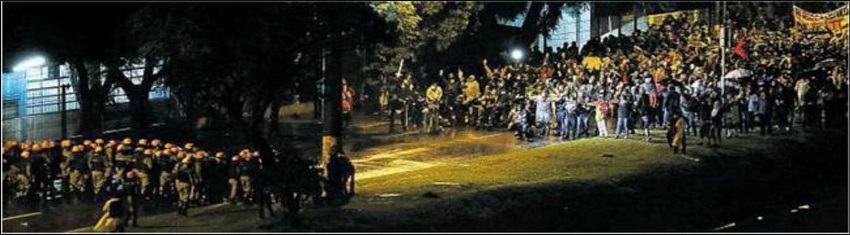 A Figura 9 , que se situa logo após a manchete “Confronto, depredação, saque: A violência se repete”, marca a “virada” emocional no enquadramento da reportagem. O quadro dominante é o confronto entre manifestantes e policiais. Não se trata de confronto físico, mas sim da representação de uma oposição, com policiais e manifestantes ocupando posições antagônicas na rua. A perspectiva aérea da imagem deixa ativistas e policiais em tamanho pequeno, mas identifica-se que o conjunto de manifestantes supera em número o conjunto de agentes policiais. É interessante notar que a imagem está mais próxima do ponto de vista dos policiais, transmitindo a impressão de que os policiais estão “acuados” pelos manifestantes, e o olhar direciona-se para a situação de tensão e confronto. A identidade dos manifestantes e as reivindicações não são especificadas, e as táticas enquadradas são a passeata (pelos ativistas) e a barreira de contenção espacial (pela polícia).
