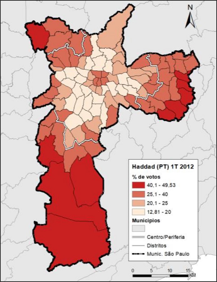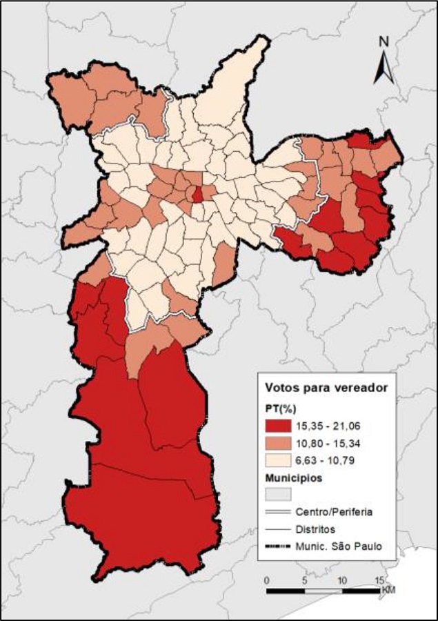 No período que abrange as eleições de 2004, 2008 e 2012, a geografia eleitoral do município era bem definida, o PT, como partido hegemônico da esquerda, apresentava os seus melhores resultados nas regiões mais periféricas da cidade (extremo Sul, Leste e Noroeste), enquanto a direita ou centro-direita ocupava os distritos mais centrais e ricos. Nas eleições de 1985 a 2000 havia também a chamada direita populista que concentrava o seu apoio eleitoral nas antigas regiões operárias das zonas Norte e Leste ( Pierucci, 1987 ; 1989; Figueiredo et al., 2002 ).