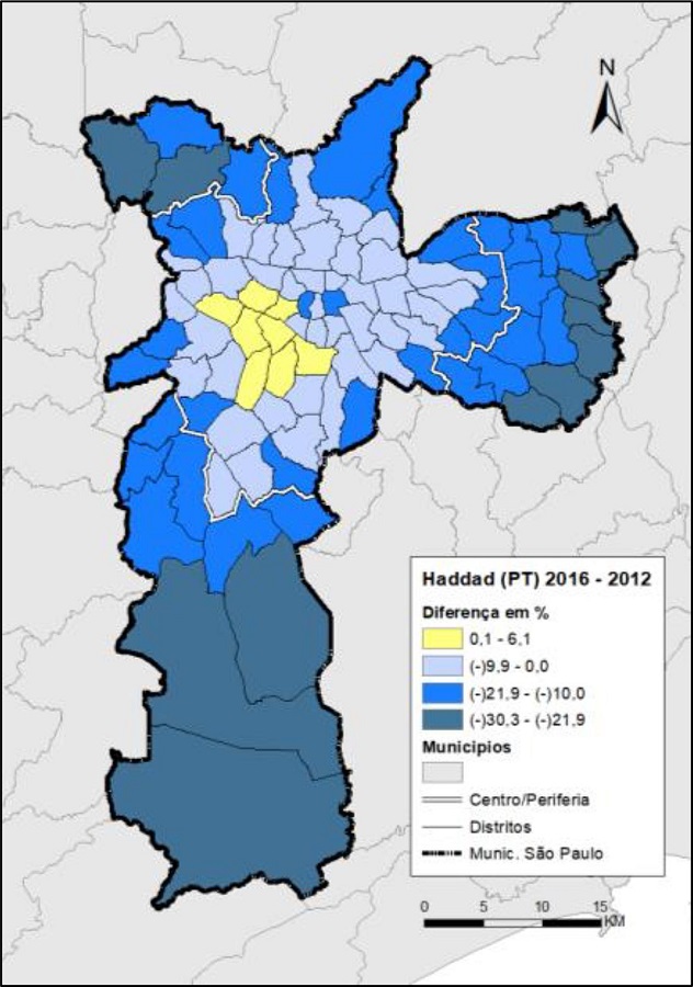 Comparando os mapas de voto do PT de 2012 e 2016, ao calcular a diferença de votos por distrito ( Mapa 3 ), é possível observar que o partido, apesar de continuar sendo bem votado nos distritos periféricos, perdeu votos em todos eles enquanto teve ganho em distritos onde o PT historicamente recebia menos apoio: Jardim Paulista, Moema, Vila Mariana, Itaim Bibi, Pinheiros, Alto Pinheiros, Perdizes e Consolação 14 .