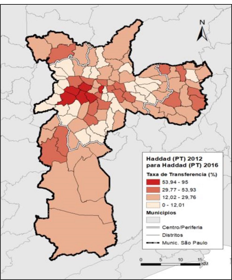 Inovamos com relação ao trabalho de Limongi e Mesquita (2008) por, além de compararmos todos os votos dos dois pleitos como é o usual, buscarmos calcular a transferência de votos em cada distrito administrativo do município isoladamente 10 , com o objetivo de analisar visualmente essa transferência de votos por meio de mapas. Segundo Andreadis e Chadjipadelis (2009 , p. 217), as estimativas locais, quando apresentadas em mapa, são capazes de revelar informações úteis sobre a variabilidade espacial das transições do eleitor que podem servir como base para pesquisas sobre a associação desses padrões com outras características demográficas e socioeconômicas 11 .