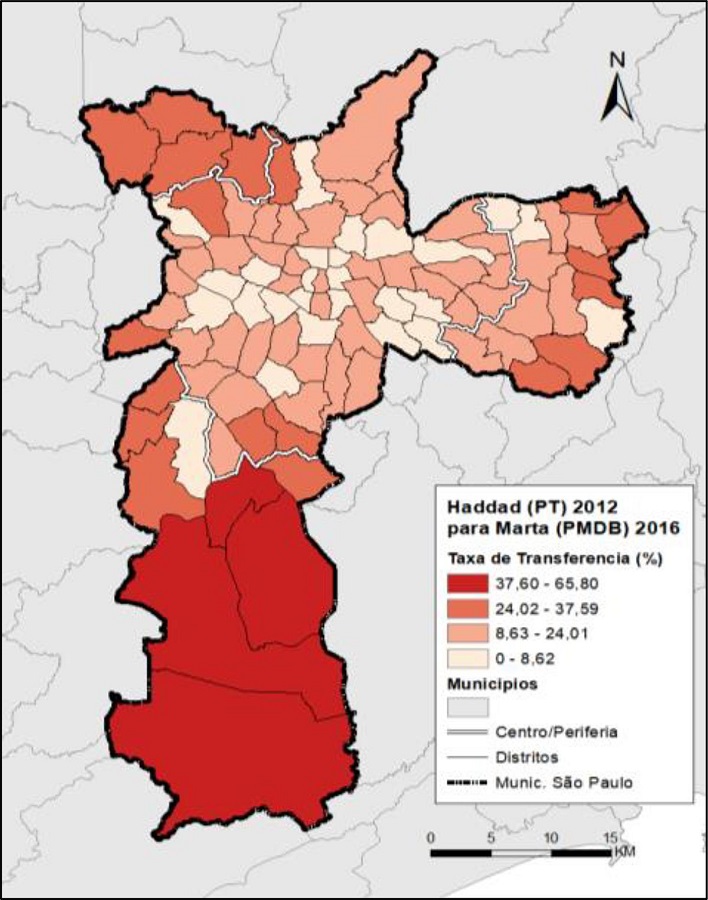 Na eleição de 2016, portanto, o eleitor puniu o PT, provavelmente pela avaliação negativa do governo Haddad e pela conjuntura nacional ainda contaminada pelo processo de impeachment da presidenta Dilma. Os votos que saem do PT se dirigem a Marta Suplicy, uma ex-petista. Essa transferência pode ser explicada tanto como um voto “estratégico”, com o abandono de uma candidatura “inviável” por outra, próxima ideologicamente e com mais condições de derrotar o pior adversário, como pelo possível apoio de vereadores do próprio partido a essa candidata naquelas regiões onde o desempenho da mesma foi melhor 19 , ou ainda uma combinação dos dois fatores.