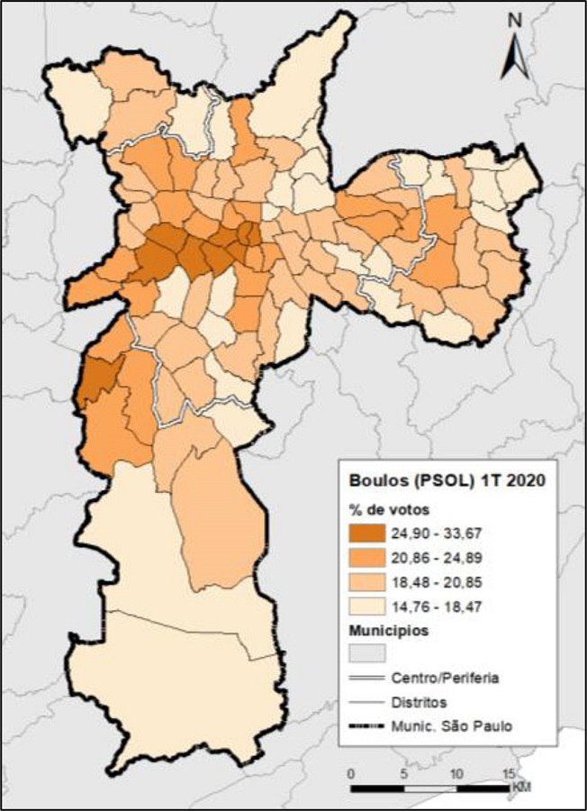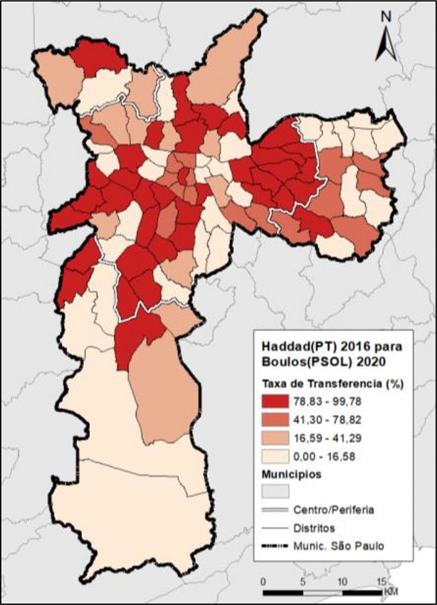 Mais ainda, calculando a transferência de votos de 2016 para 2020 ( Gráfico 4 ), verificamos que quase 35% dos votos de Guilherme Boulos, do PSOL, em 2020 vieram do candidato do PT em 2016. Se realizarmos esse mesmo cálculo, agora na escala dos distritos administrativos ( Mapa 11 ), observamos que essa transferência se deu mais nos distritos centrais do município, nos quais historicamente o PT tem menos apoio 22 . Essa constatação faz sentido se pensarmos que o padrão de votação do PT de 2016 foi desviante do seu histórico, ou seja, aqueles que votaram nele nessas regiões não eram eleitores “duros” do partido. Porém, de qualquer forma, esses últimos eleitores, fazendo um voto “estratégico” em 2020, optaram por um candidato do mesmo espectro ideológico (Boulos), o que significa, portanto, a manutenção do alinhamento ideológico e a possível consolidação de uma nova região de apoio à esquerda na cidade, não necessariamente ligada a um partido específico.