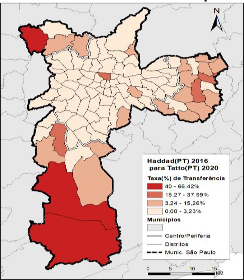 A transferência de votos entre as eleições de 2016 e 2020 mostra uma “volta” dos votos das regiões tradicionais petistas para o partido. Apesar disso, essa volta ao padrão espacial de votação tradicional do partido não significou um igual retorno da sua força eleitoral em comparação, por exemplo, com a eleição municipal de 2012. Por outro lado, nas regiões onde Fernando Haddad do PT teve sua maior votação, o “corredor das universidades”, o candidato do PT, Jilmar Tatto, não conseguiu manter o mesmo desempenho; esse voto migrou para Guilherme Boulos do PSOL, candidato da esquerda que despontou nas pesquisas como o mais viável desafiante do candidato da direita, Bruno Covas do PSDB.