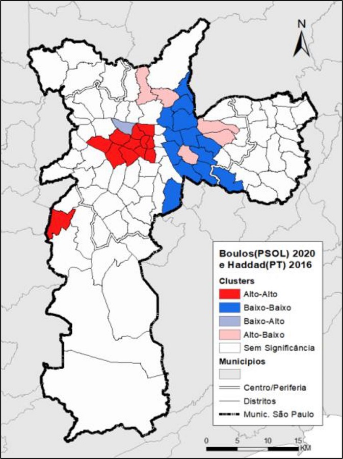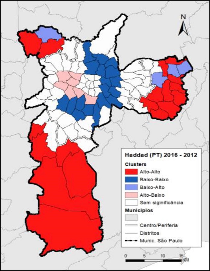 Com o objetivo de comparar os mapas de votos dos candidatos, buscando diferenças e similaridades entre eles, utilizamos o método de análise de cluster espacial por meio da versão local do índice bivariado de Moran 7 ( Anselin, 1995 ) LISA 8 que calcula a autocorrelação espacial entre unidades espaciais e pode ser interpretado “como o grau de semelhança entre um padrão espacial e outro” ( Terron; Soares, 2010 , p. 320). Como vemos adiante, a análise de cluster espacial gera quatro tipos formados a partir da correlação entre as unidades espaciais informando a similaridade entre elas: Alto-Alto, Baixo-Baixo, Baixo-Alto, Alto-Baixo.