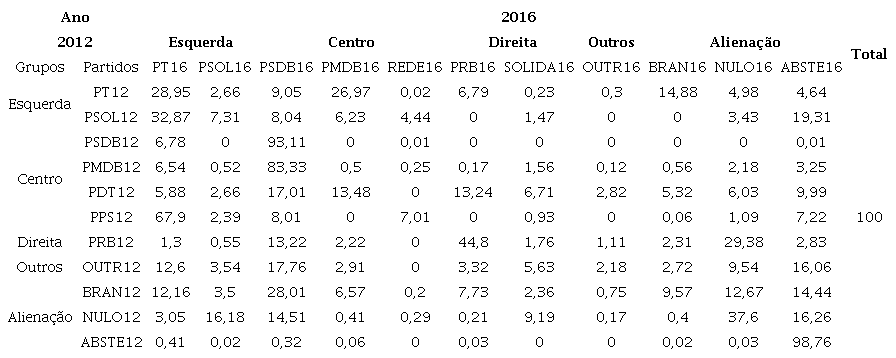 Para testar a hipótese de que não houve realinhamento em 2016, ou seja, que os eleitores do PT de 2012 não apoiaram Doria do PSDB em 2016, mas sim realizaram um voto “estratégico” respeitando os grupos ideológicos, buscamos investigar a taxa de transferência de votos de 2012 a 2016 utilizando o método de Grofman e Merrill (2004) , adaptado por Andreadis e Chadjipadelis (2009) . O resultado dessa análise ( Gráfico 2 , Anexo 4 ) mostra que quase a totalidade dos eleitores do PSDB em 2012 (93%) repetiram o seu voto no partido em 2016, enquanto entre os eleitores do PT essa taxa foi de apenas 29%, os restantes decidiram apoiar a candidata Marta Suplicy do PMDB (27%), que havia sido prefeita pelo PT no período de 2000 a 2004, ou votaram em branco ou nulo (20%). Ou seja, aqueles que votaram em Haddad do PT em 2012 e decidiram não votar pela sua reeleição escolheram Marta Suplicy ou simplesmente desperdiçaram o seu voto. Isso pode ter contribuído para a alta alienação eleitoral (brancos e nulos) e abstenção daquela eleição, que foi um dos fatores que garantiu a vitória de Doria (PSDB) no primeiro turno, já que quanto menor a quantidade de votos válidos em uma eleição, mais fácil alcançar os 50% + 1 necessários para a vitória em primeiro turno.