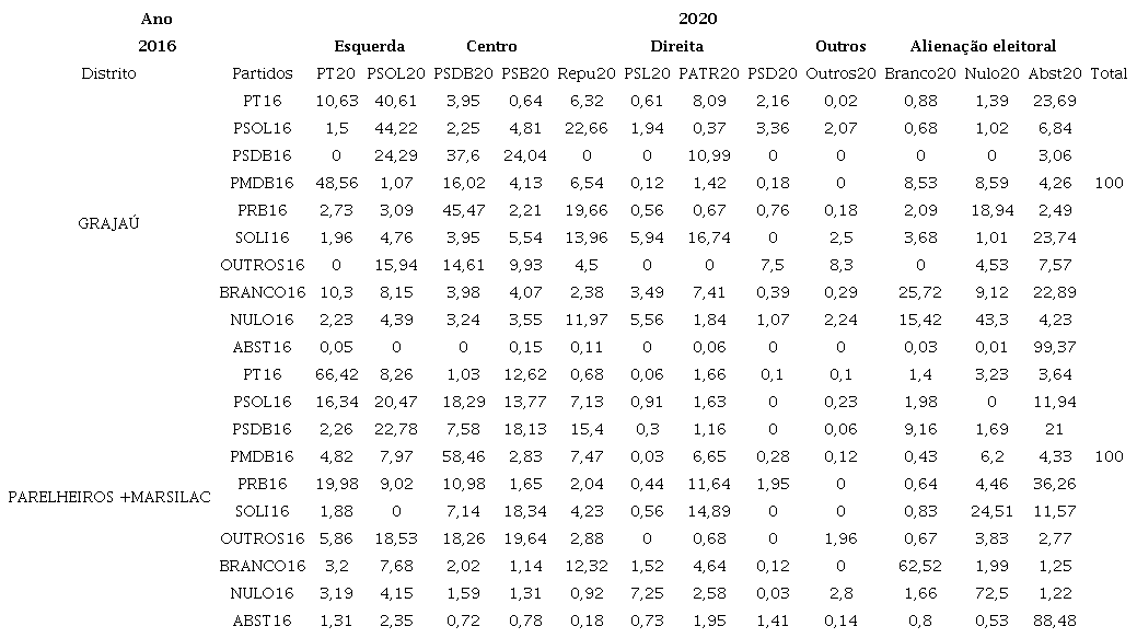 Abstract: The 2016 and 2020 municipal elections in São Paulo’s city presented results that deviated from previous ones in the spatial voting patterns and in candidate performance. While the PT in 2016 did not win in any district, with part of these votes "stolen" by Marta Suplicy (PMDB), in 2020 the party, for the first time since 1985, was not among the first place contenders, a position occupied by the PSOL. Through mapping and factor analysis, the present article provides evidence for this deviation and seeks possible explanations by analyzing, through ecological inference, the transfer of votes from one election to another among candidates. The article defends the hypothesis that this transfer is due more to a strategic vote than to electoral realignments. The results show that there was no change in "voter alignment" and the deviations found attributed to the competition strategies adopted by the parties.