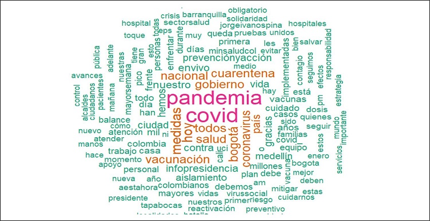 Después de calcular la frecuencia de las palabras, se hizo una nube de las palabras más utilizadas (ver Figura 1 ). Se resalta la importancia de las palabras “Covid” y “pandemia” al hacer referencia a la situación. Adicionalmente, se observan palabras como “cuarentena”, “vacunación”, “medidas” y “salud”, que hablan de los mensajes más importantes realizados en la coyuntura. Esta nube de palabras representa la frecuencia de algunas palabras, pero a efectos del análisis de sentimientos, es a partir del uso de ciertas palabras que se puede distinguir la connotación positiva o negativa del mensaje.
