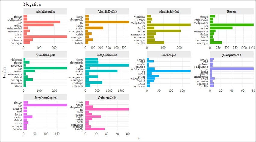 Abstract: This paper investigates how government communications on Twitter®, in the context of the Covid-19 crisis, has produced different feelings among citizens. This type of interaction has effects on the perception of rulers and compliance with restrictions. Using R's tidytext package, a total of 28,344 Covid-related tweets were analyzed between January 2020 and March 2021 from ten user profiles on Twitter® (the mayors and Town Halls of Barranquilla, Bogotá, Cali, and Medellín, the President, and the presidency). The study seeks to contribute to the field of government communications during the Covid-19 crisis and the feelings they arouse toward citizen and government interactions during the study period.