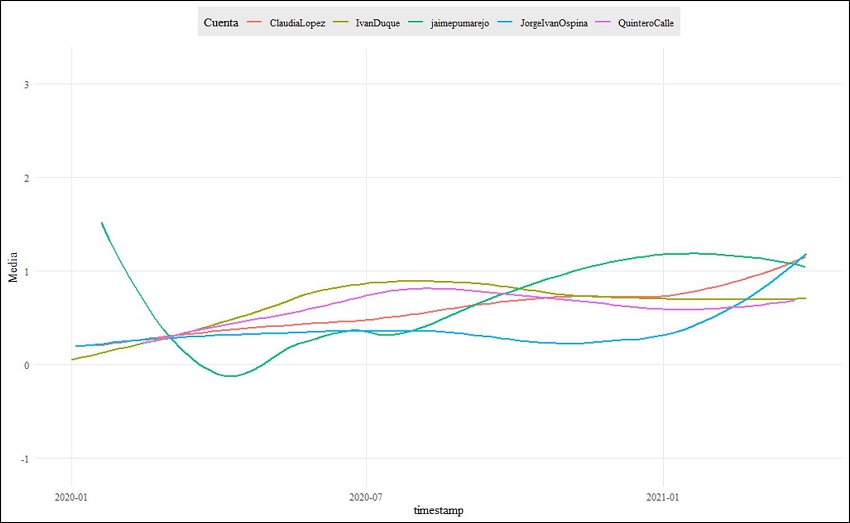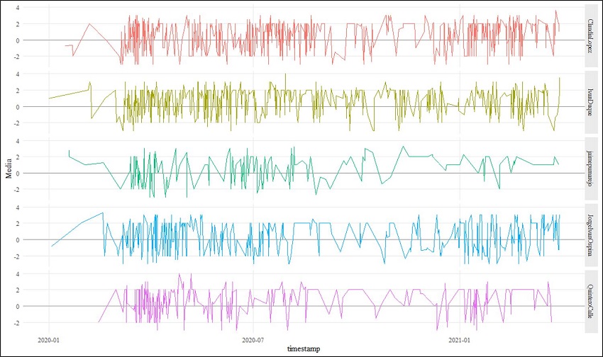 La Figura 5 grafica valores promedio suavizados en el tiempo de la puntuación presentada anteriormente. Este promedio muestra una tendencia en aumento del número de mensajes sobre la pandemia en el paso del tiempo. Si bien existen diferentes patrones de evolución de los sentimientos positivos y negativos en los trinos de los políticos, también se observa una inclinación general a favor de la comunicación de mensajes asociados a la generación de sentimientos positivos.