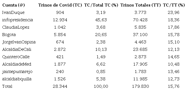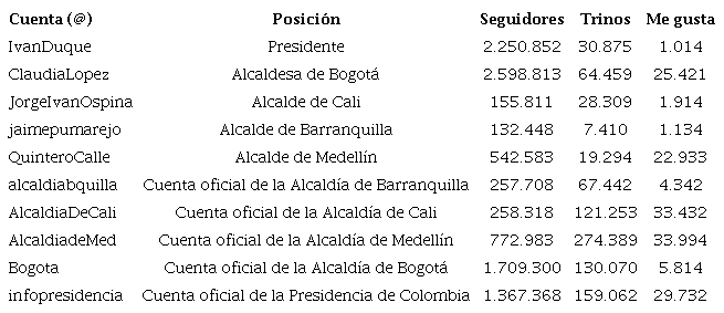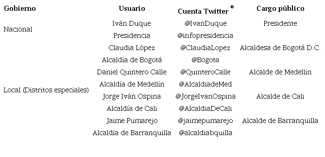 La muestra está compuesta por los trinos de la cuenta oficial de la Presidencia de la Nación y la cuenta personal de Iván Duque Márquez, Presidente de turno durante el periodo analizado. Por otro lado, se hizo el mismo seguimiento a las cuentas personales verificadas de los Alcaldes de Barranquilla, Bogotá, Cali y Medellín, así como las cuentas oficiales en Twitter ® de las Alcaldías de estos Distritos especiales (ver Tabla 1 ). La razón de hacer seguimiento a los perfiles personales de las autoridades políticas electas popularmente a estos cargos consiste en el alto nivel de personalismo político asociado a las dinámicas propias de los cargos públicos de elección uninominal.