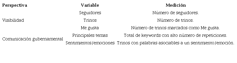 La información que se utilizó en este artículo se articula en dos categorías para dar cuenta del nivel de visibilidad de los usuarios tenidos en cuenta en este artículo y elementos claves de la comunicación gubernamental (ver Tabla 2 ):