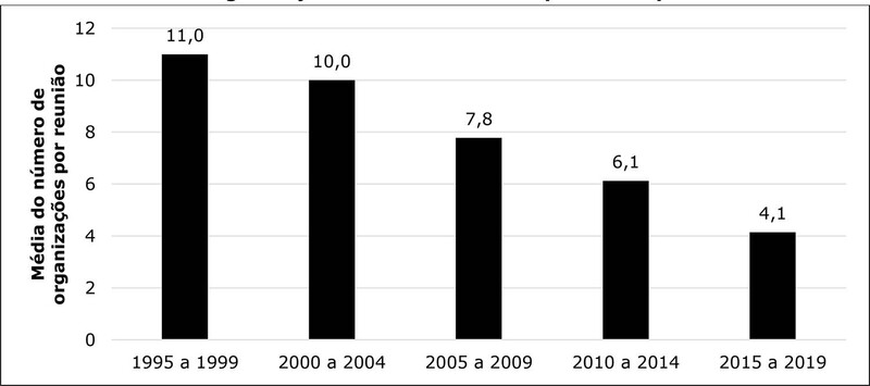No período de 1995 a 1999, cada reunião do SGT10 contou, em média, com 11 organizações sociais dos quatro Estados-Partes do Mercosul. No último período, 2015 a 2019, esse número foi reduzido para 4. Assim, pode-se falar em uma redução gradual da participação dos atores sociais nessas reuniões. A presença maior ocorreu no momento de aprofundamento e ampliação da agenda do Mercosul, principalmente após 1995, início da segunda fase do bloco, fase de otimismo e de consolidação do processo de integração no discurso diplomático brasileiro ( Onuki, 2006 ). Esse otimismo explicaria, em parte, a maior presença de atores nesse período.