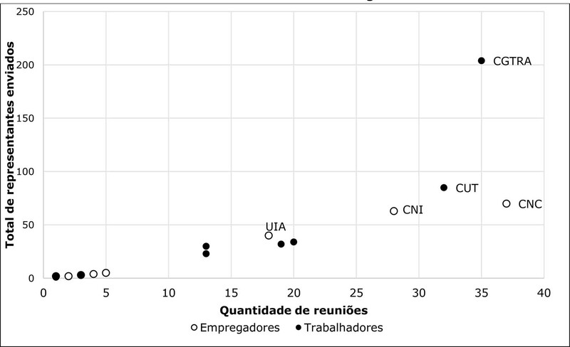 Os atores da Argentina que mais participaram de reuniões foram a CGTRA (trabalhadores) e a UIA (empregadores). Dos representantes dos empregadores brasileiros, a maior presença foi da Confederação Nacional do Comércio de Bens, Serviços e Turismo (CNC). Contudo, para manter simetria com a UIA, optou-se por analisar a CNI, já que ela representa, também, interesses da indústria. Do lado dos representantes dos trabalhadores brasileiros, a CUT foi a organização que mais esteve presente. Destaca-se, ainda, a CGTRA, a qual apresenta uma intensidade de participação (quantidade de representantes enviados) superior às demais entidades. Assim, torna-se relevante avaliar qual papel esse ator desempenhou no SGT 10.