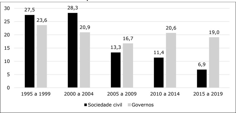 Além disso, outro indicador importante do gradual declínio da presença desses atores é visível quando se compara o número de representantes da sociedade civil com o número de representantes dos governos. O Gráfico 3 apresenta a evolução do número de representantes dos governos em relação ao dos atores sociais por quinquênio6: