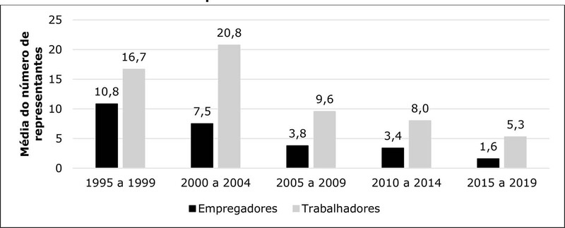 Os trabalhadores mantêm, em média, um número maior de representantes do que os empregadores ao longo dos cinco períodos analisados. Os sindicatos chegam a apresentar um crescimento na média entre os dois primeiros períodos. Porém, entre 2005 e 2009, passam a reduzir a sua participação. Os empresários tiveram uma redução constante da sua participação nos períodos em tela. Portanto, o conjunto de atores revela comportamentos diferentes no que diz respeito à intensidade de sua participação, ainda que ambos tenham reduzido sua presença no SGT10 nos últimos anos.