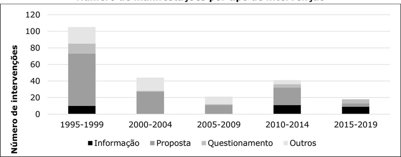 À primeira vista, é possível notar considerável redução no número de intervenções realizadas pelos atores sociais da Argentina e do Brasil. As intervenções correspondem aqui ao segundo elemento da inclusão, nos termos de Graham Smith: a voz . Seria compreensível que a redução da presença, mostrada na seção precedente deste artigo, tivesse um reflexo sobre as intervenções dos atores sociais aqui analisados. O número de intervenções totais desses atores reduziu de 105, entre 1995 e 1999, para 18, entre 2015 e 2019. Isto é, uma queda de aproximadamente 83%. Ademais, a redução também é qualitativa. No primeiro período, 60% das intervenções foram realizadas por meio de apresentação ou discussão de propostas, evidenciando uma atuação mais propositiva e interessada dos atores em questão. Contudo, entre 2015 e 2019, essa proporção caiu para 22%.