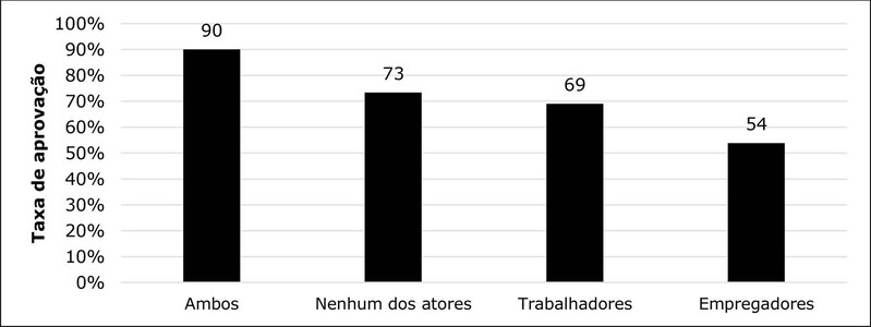 A maior taxa de aprovação foi encontrada quando a propositura foi de ambos os atores, ou seja, empregadores e trabalhadores em conjunto. O que reforça a ideia de que a atuação convergente favorece a aceitação de determinada proposta. A menor taxa foi encontrada para os empregadores, que ficou em 54%. Das 71 propostas dos sindicatos, 69% delas foram aprovadas, o que ficou próximo à taxa de aprovação total das propostas (70%).