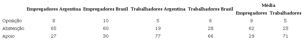 Foi possível identificar, também, convergência entre empregadores ou trabalhadores dos dois países. Isso permitiu agregar os posicionamentos. Ou seja: quando algum ator não se posicionava (abstenção), porém o seu homólogo era favorável, considerou-se esta como a posição do setor. A finalidade desse procedimento foi comparar a aprovação das propostas cruzando o posicionamento de cada setor, como aparece na Tabela 2: