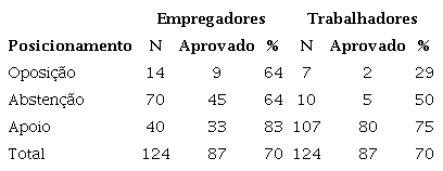 Além disso, os atores diferenciam-se no que pode ser entendido como "chance de eficácia da oposição". Das 13 propostas que contaram com oposição dos empregadores, porém apoio dos trabalhadores, 9 foram aprovadas (69%). Ao passo que das 6 propostas que receberam oposição dos trabalhadores, porém apoiadas pelos empregadores, apenas 2 foram acatadas (33%). Nesse sentido, ainda que não se possa estabelecer causalidade, a oposição dos empregadores reduziu a chance de aprovação em 31%, enquanto a dos trabalhadores em 67%.