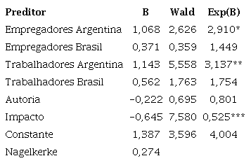 Por fim, para avaliar as variáveis apresentadas, aplicou-se uma regressão logística multivariada, tendo como variável dependente a aprovação, ou não, da proposta, ou seja, 1 para aprovada, 0 para não aprovada. Como preditores, ou variáveis independentes, foram escolhidos os posicionamentos dos empregadores da Argentina e do Brasil, dos trabalhadores da Argentina e do Brasil, a autoria e o impacto da proposta. Os resultados são apresentados na Tabela 3: