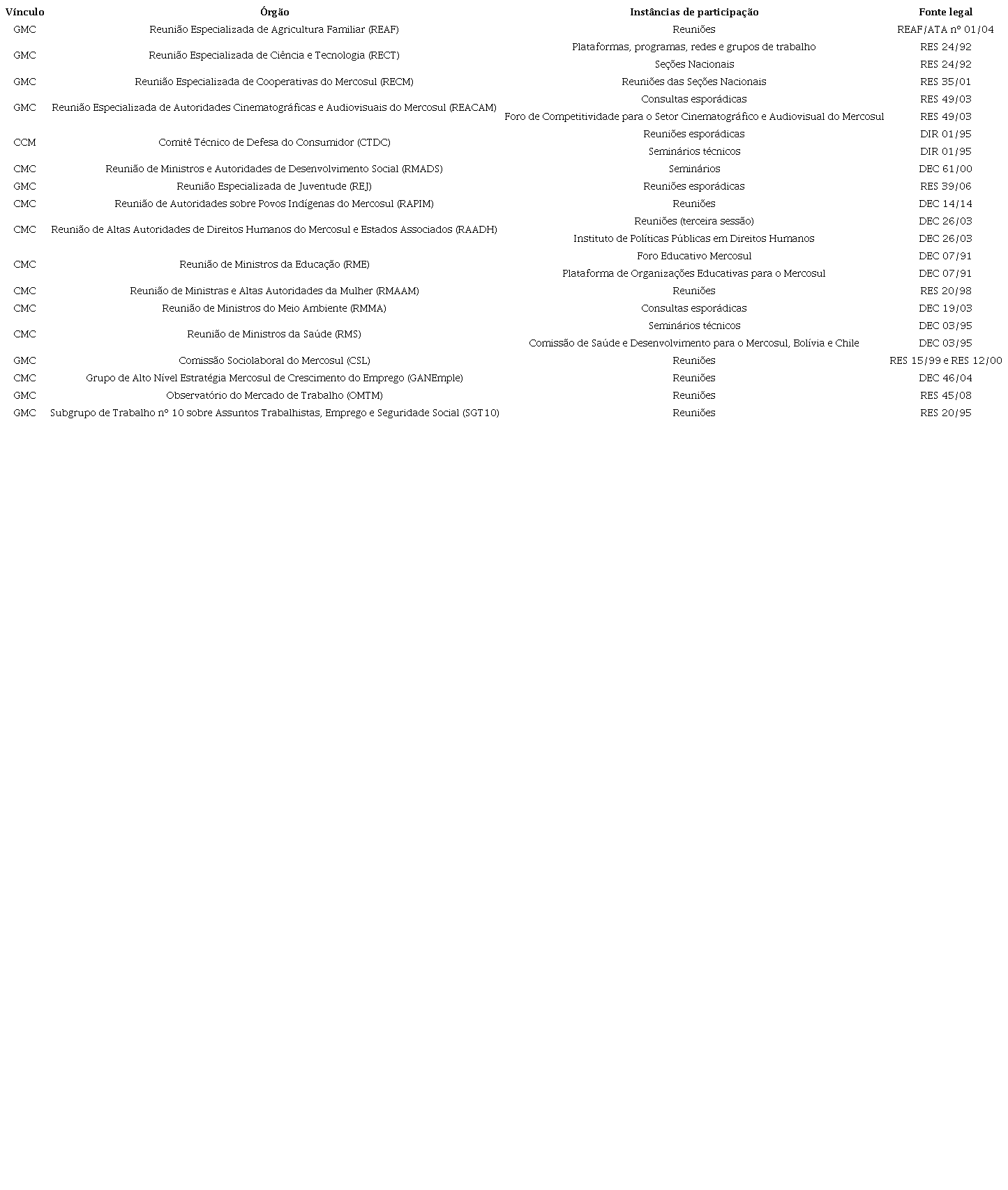 Como se pode notar, houve uma tentativa de se institucionalizar a participação no Mercosul por meio da proliferação de órgãos e instâncias destinadas a dar voz aos interesses organizados de atores não governamentais dos Estados-membros. O Quadro 1 apresenta uma síntese desses órgãos e instâncias nas quais esses atores podem participar por meio de reuniões, seminários, consultas públicas, entre outras modalidades: