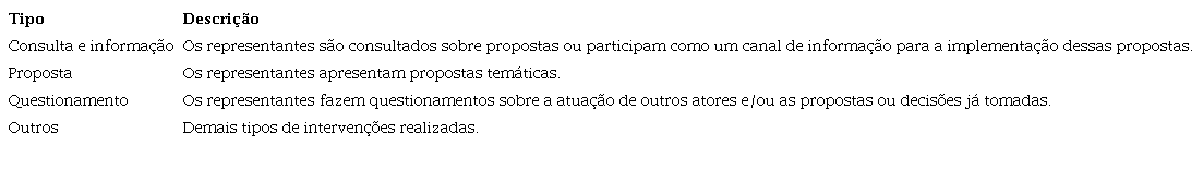 Quanto à segunda categoria, o tipo de intervenção refere-se à qual manifestação o ator realizou nas reuniões. Foram categorizados quatro tipos ( Quadro 2 ). Com isso, foi possível mapear as intervenções dos representantes do setor empresarial brasileiro e argentino, respectivamente CNI e UIA, de um lado. De outro, foi possível identificar as intervenções dos representantes dos trabalhadores brasileiros e argentinos, respectivamente CUT e CGTRA, durante as discussões realizadas dentro do Subgrupo e nas comissões derivadas dele. Desse modo, os temas mais sensíveis a cada um dos atores foram identificados, assim como quais convergências e divergências temáticas existiram entre eles. Suas intervenções nas reuniões foram classificadas conforme o Quadro 2: