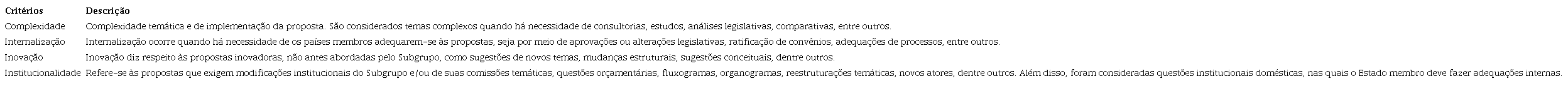 Na sequência, essas propostas e ações foram classificadas conforme o teor da pauta, por meio de análise em double review, a fim de identificar o impacto potencial da implementação e a relevância do tema para os países membros do Mercosul. Para isso foram considerados, de forma binária, quatro critérios apresentados no Quadro 3 . A somatória dos critérios resultou na variável denominada de " impacto ", a qual poderia variar de 1 a 4. Sendo: 1, impacto muito baixo; 2, baixo; 3, alto; e 4, impacto muito alto. Essa variável permitiu avaliar os conteúdos das propostas apresentadas, discutidas e aprovadas dentro do SGT. Porém, não houve uma avaliação da conversão dessas propostas em decisões aprovadas no GMC, pois o impacto é definido aqui apenas para compreender a natureza e a importância dos conteúdos aprovados no SGT. Dessa forma, o objetivo não foi avaliar os resultados da participação, que poderiam ser mensurados por meio da análise das propostas aprovadas na instância decisória do GMC.